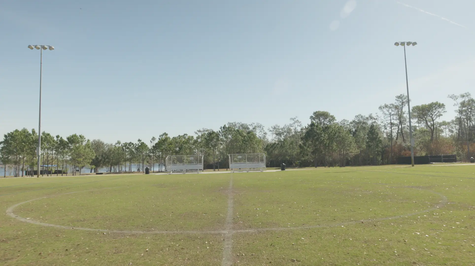 Footage of an empty soccer (football) field where the camera dollies in towards the center of the field. Great for adding a CG stadium and crowd to totally redesign the scene.